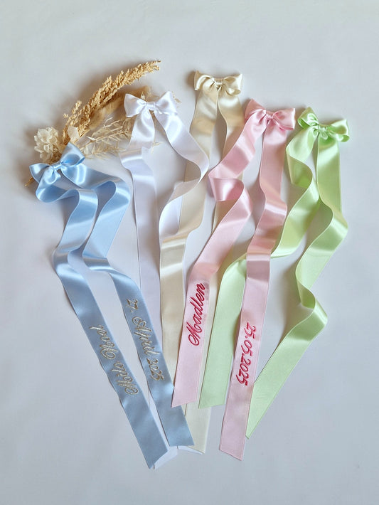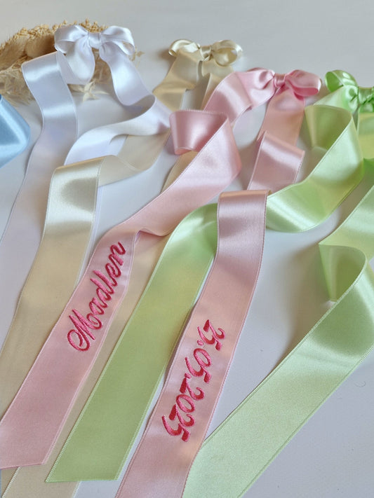 Verleihen Sie dem Taufkleid Ihres Kindes eine ganz besondere Note mit unseren edlen, liebevoll gestalteten Schleifen aus hochwertigem Satin. Die Schleife kann nach Wunsch mit dem Namen und dem Tauf- oder Geburtsdatum des Kindes in der Wunschfarbe bestickt werden – für ein unvergessliches Erinnerungsstück. Perfekt für diesen besonderen Tag!
