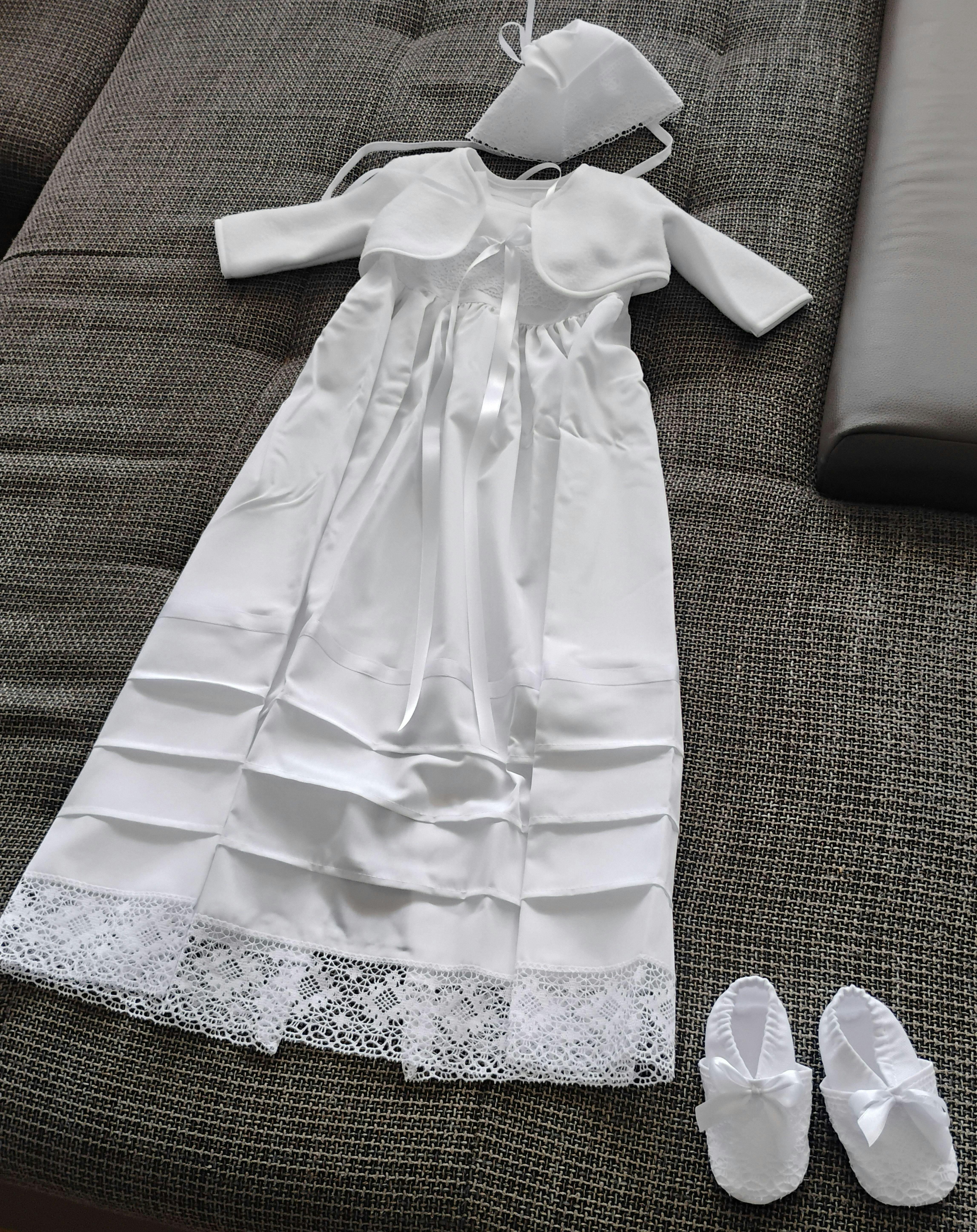 Wunderschönes Taufset, bestehend aus Taufkleid und Häubchen, handgefertigt aus feinem Baumwollbatist und mit Klöppelspitze aus 100 % Baumwolle verziert.