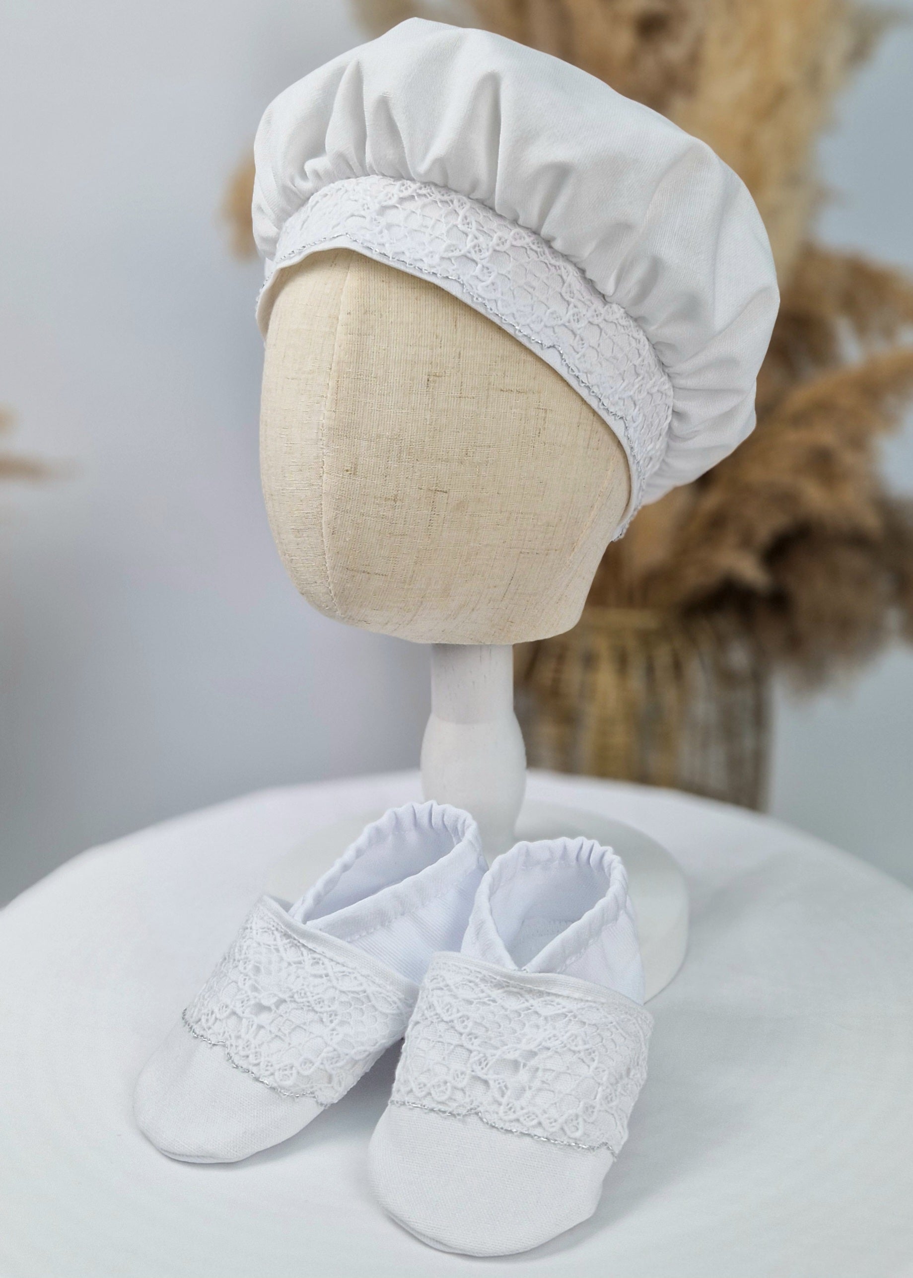 Gerne nähen wir passendes Zubehör dazu: Taufmütze - 25,00 EUR, Taufschuhe - 21,00 EUR. Kontaktieren Sie uns einfach diesbezüglich im Checkout!