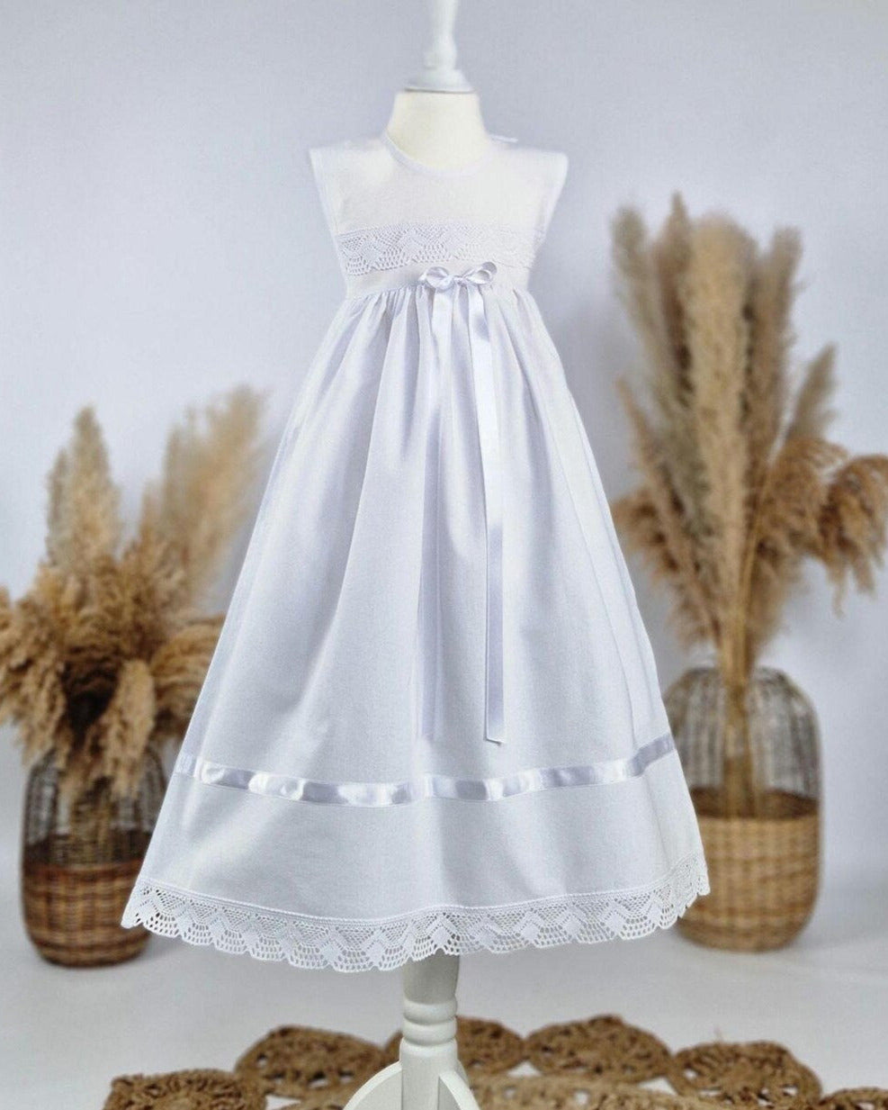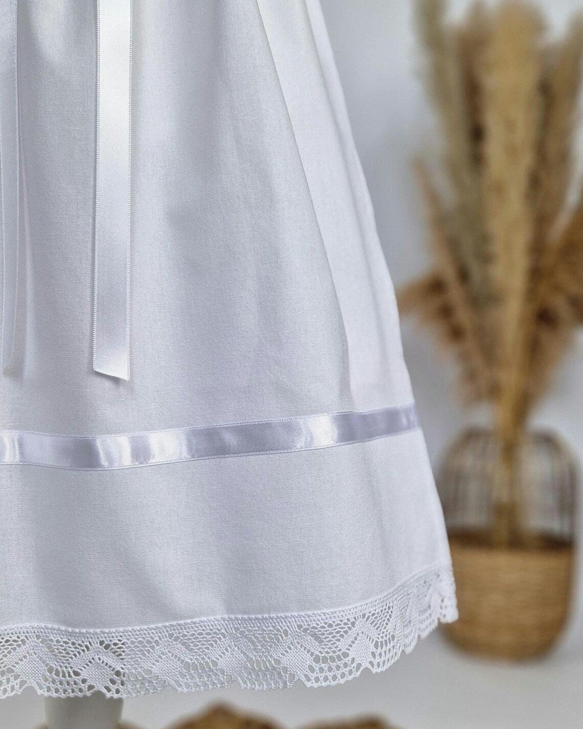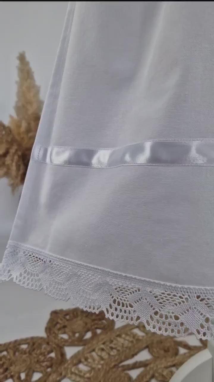 Handgefertigter Taufaufleger für Mädchen und Jungen in der Einheitsgröße, genäht aus edlem Halbleinen (52%Baumwolle + 48% Leinen) mit wunderschöner Baumwollspitze.